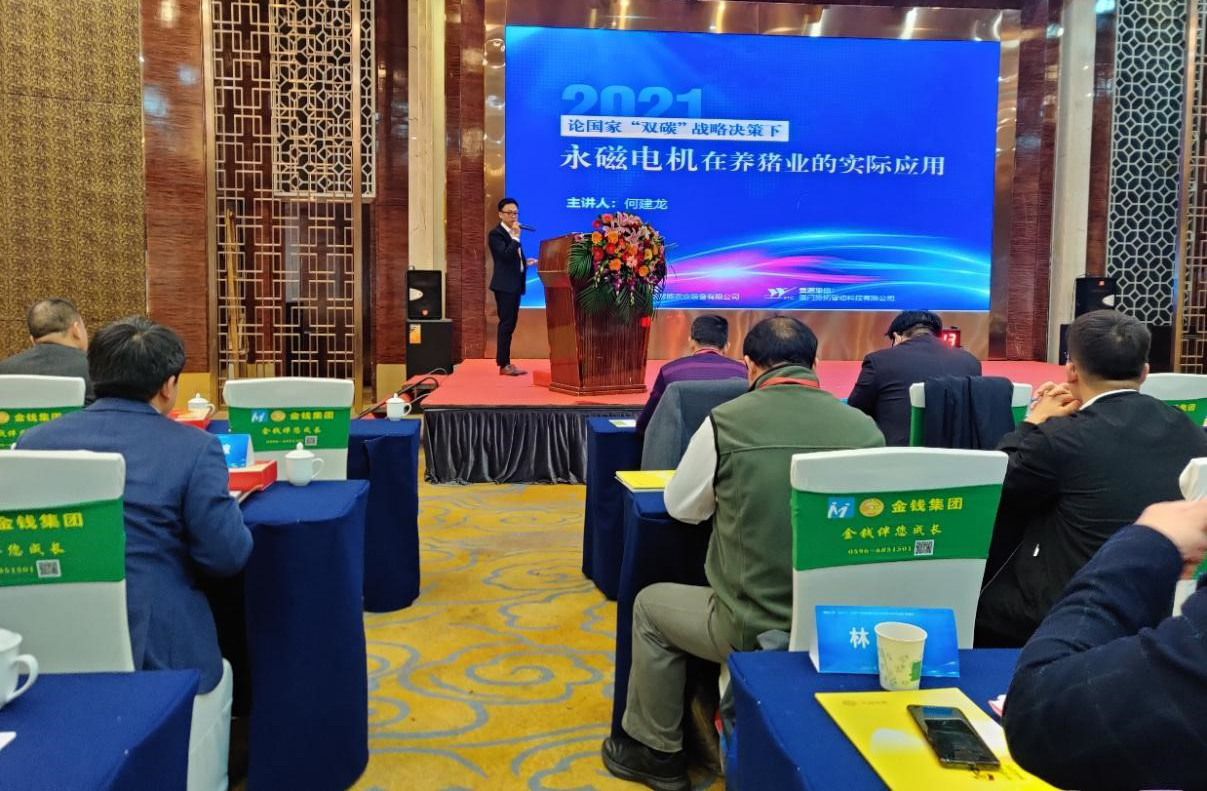 2021年12月29日至30日,“『豬場之旅』2021行:生豬產(chǎn)業(yè)高質(zhì)量發(fā)展巡回報告會”收官盛典在福建省三明市沙縣區(qū)君華大酒店隆重舉行。廈門勢拓智動科技有限公司總經(jīng)理李宓貞和市場部總監(jiān)何建龍等一行人出席此次報告會。會上,何建龍總監(jiān)為與會聽眾帶來了一場名為“國家‘雙碳’戰(zhàn)略決策下永磁電機在養(yǎng)豬業(yè)的實際應(yīng)用”的精彩報告,詳細介紹了永磁電機如何助力畜牧業(yè)碳減排,為國家實現(xiàn)雙碳目標做貢獻。